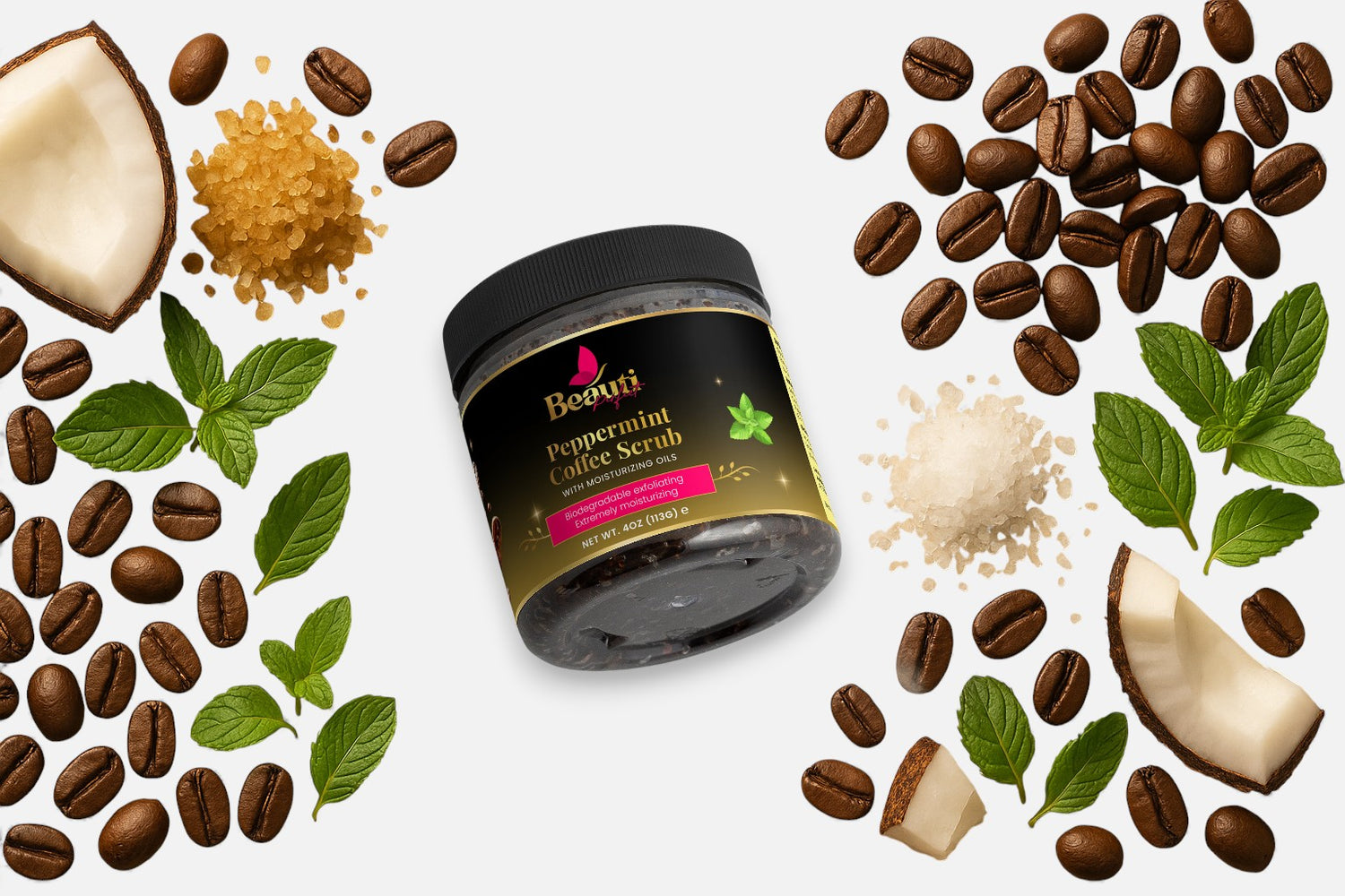 An energizing exfoliating scrub crafted with coffee, sugar, and peppermint to smooth, hydrate, and brighten your skin for a fresh, youthful glow.
